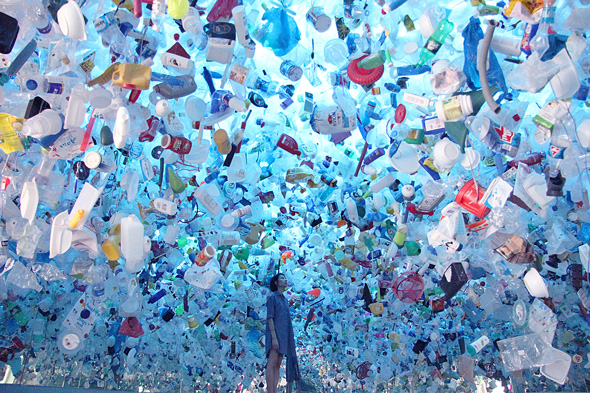 Tan Zi Xi, illustratrice e artista di Singapore, ha creato un’installazione composta da oltre 20.000 rifiuti di plastica, sospesi a mezz’aria per ottenere l’effetto di essere sott’acqua, accresciuto dagli specchi sulle pareti e dalle luci blu.