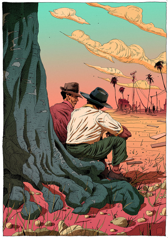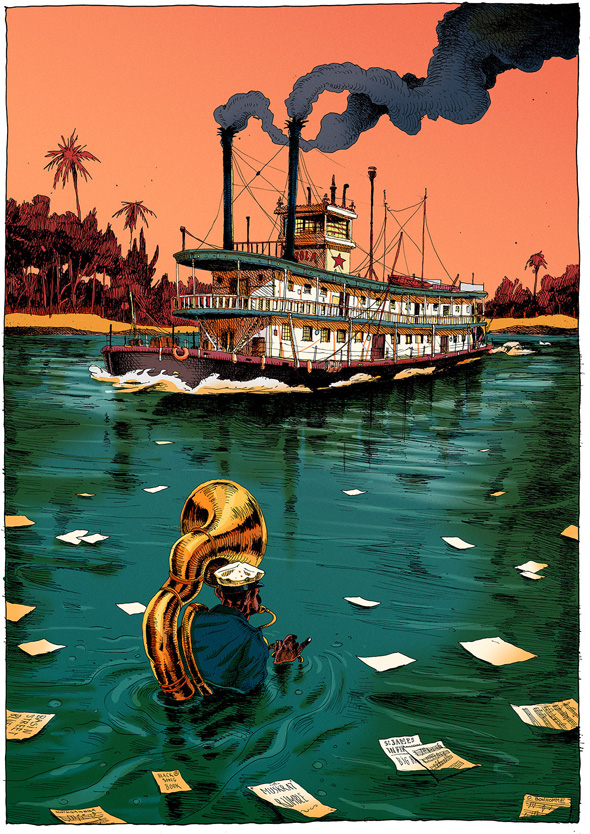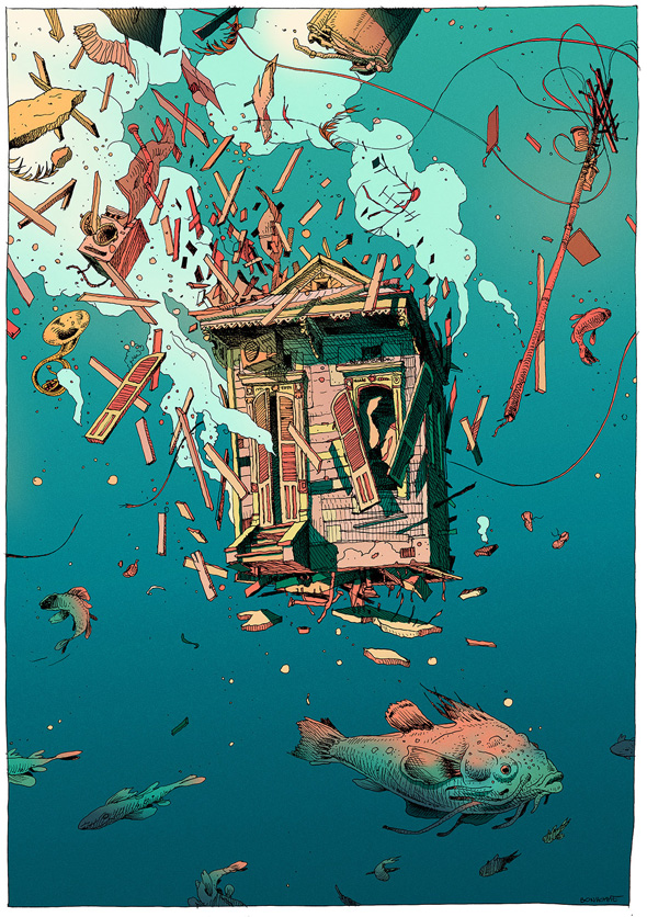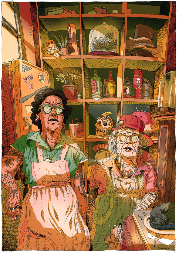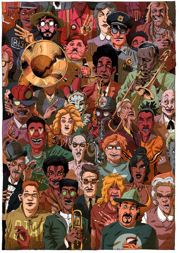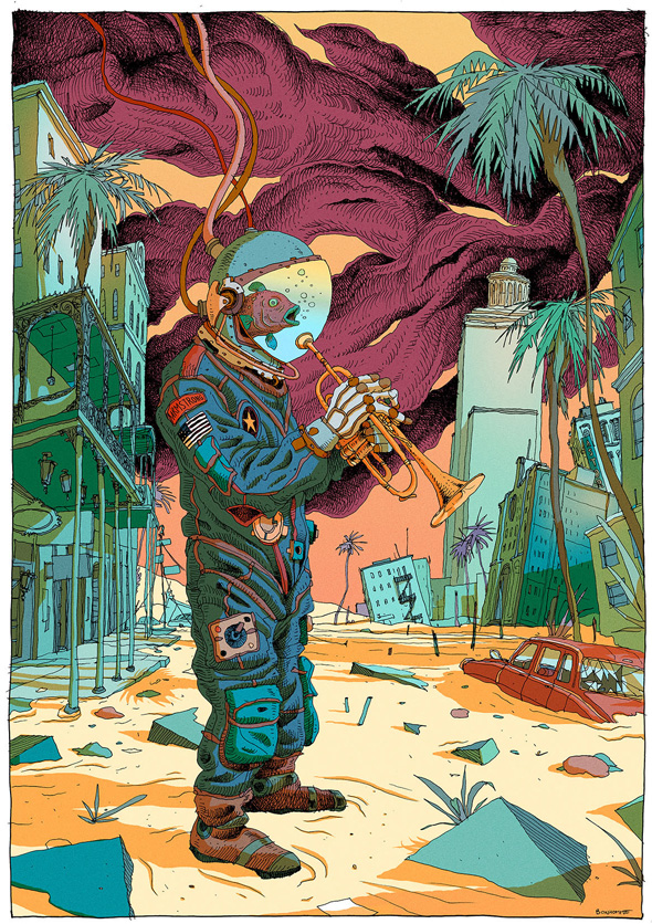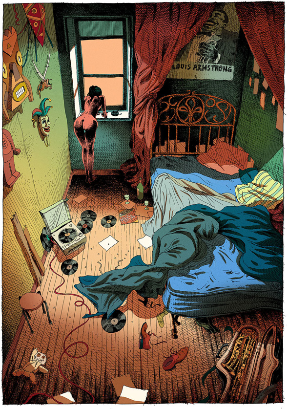 Olivier Bonhomme, musicista jazz e vignettista francese originario di Lione ha fatto un viaggio immaginario in una spettrale New Orleans popolata da musicisti stravaganti, riti voodoo, e dolci allucinogeni, che ci presenta in Journey to New Orleans, una serie di illustrazioni fedeli al suo potente stile personale, chiaramente influenzato dal fumetto francese ed europeo e da autoricome Moebius o Nicolas de Crécy.