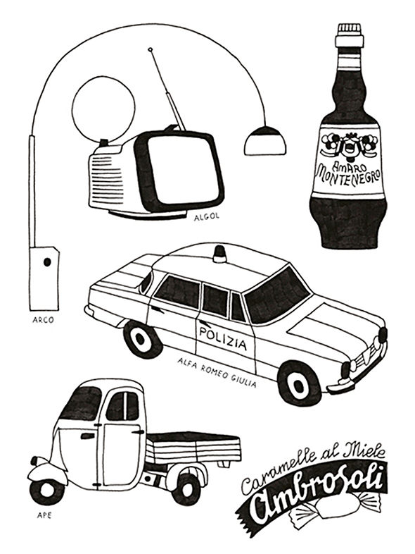 Stile semplice, dicevo, come il titolo del suo blog-portfolio, che è quasi disarmante: disegnolecose.tumblr.com. E questo fa: ogni cosa che attrae la sua curiosità viene riprodotta con un tratto bianco e nero, diretto e sincero, lasciandoci la meraviglia, e qualche volta lo struggimento, nel riscoprire oggetti vecchi e nuovi che hanno fanno parte della nostra vita. La sua è una vera e propria collezione di modernariato, un archivio disegnato come la Encyclopédie di Diderot e d’Alembert in versione pop vintage. Responsabile di questa sua “ossessione” è stata, tra l’altro, proprio la vecchia enciclopedia illustrata Conoscere, che ha rappresentato un caposaldo didattico per molte famiglie italiane degli anni ’60.
