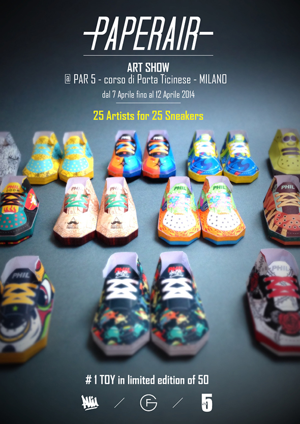 25 sneakers di carta per 25 illustratori. Un progetto innovativo che fonde illustrazione, paper art, street art, sneakers e design. Paper Air è uno degli appuntamenti della Milano Design Week 2014 che non potete proprio perdervi. La mostra è organizzata da Federico Giuliani e dal nostro Filippo Phil Toys Perin, di cui avete sentito parlare parecchio su PICAME nell’ultimo periodo. La sua passione per le scarpe sportive lo ha portato a realizzare un template ispirato ad una sneaker icona che ha poi affidato ai singoli artisti chiedendo loro di reinterpretarla liberamente. Dal 7 al 12 aprile presso PAR 5, in Corso di Porta Ticinese 15 a Milano, potrete guastarvi le creazioni di Ale Giorgini, Mauro Gatti, Francesco Poroli, Nicola Ferrarese, Gloria Pizzilli, Panfilia Iannarone, Jacopo Rosati, Stefano Colferai, Marco Goran Romano, Fabio Marangoni, Matteo Cuccato, Federico Giuliani, Rubens Cantuni, Alberto Corradi, Marika Zottino, Onibaka, Rita Petruccioli, No Curves, Stefano Marra, Oscar Diodoro, David Sossella, Fonzy Nils, Lucia Fioretti, Tram, Davide Barco e naturalmente lo stesso Phil Toys. Alcuni di loro, come sapete, li ritroveremo anche durante BACK2BACK 2014.