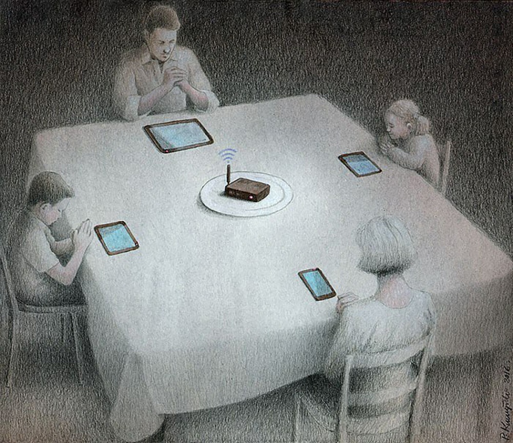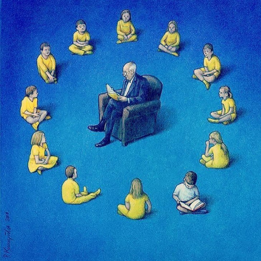 È arduo scegliere un nucleo di immagini rappresentative nella sua vastissima produzione. Sono tutte parimenti concise, brillanti, affilate. Diplomato presso l’Accademia di Belle Arti di Poznan, Kuczynski ha uno stile ruvido e realistico che ben si accompagna alle tematiche delle sue illustrazioni. Su Instagram ha una vera e propria schiera di seguaci che condividono il suo pensiero critico.