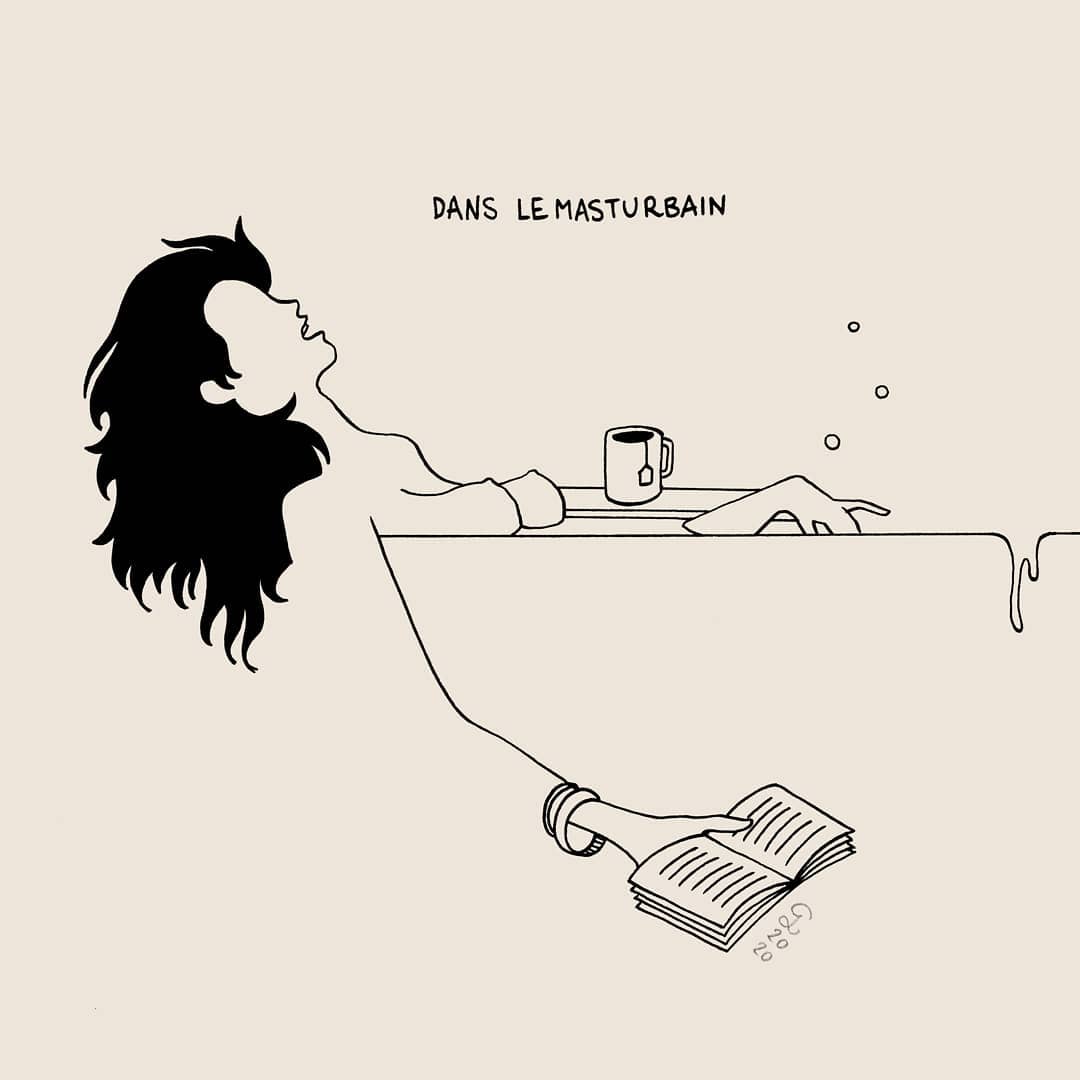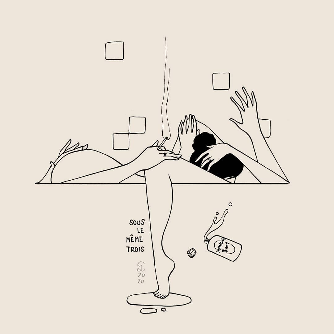 “Méryl lives in Lyon, in a house-share. Her lover does not lives with her during the confinement, so she has to take twists and turns to send him kinky pictures without being caught by her flatmates… So preparing the coffee early in the morning becomes easily a spicy moment! Caption means “strong coffee”, but “corsé” can mean strong (for coffee or spices) but also spicy”.