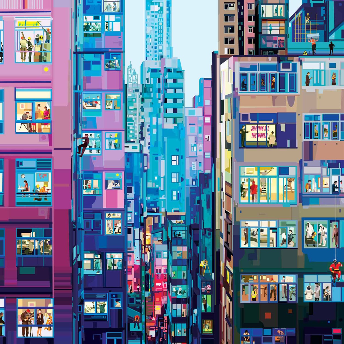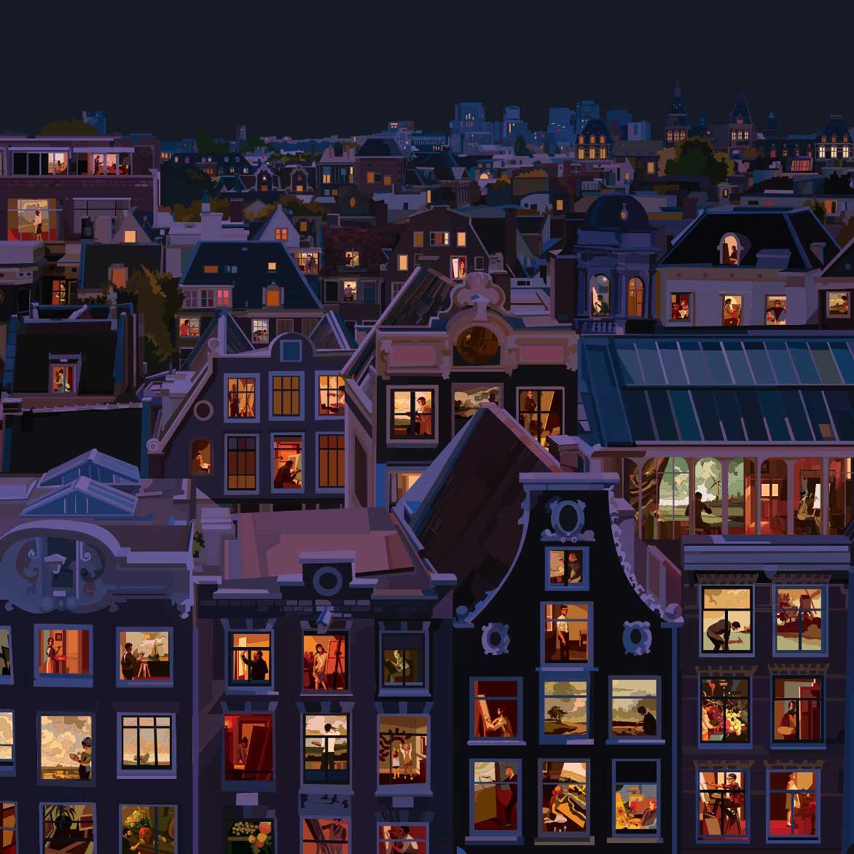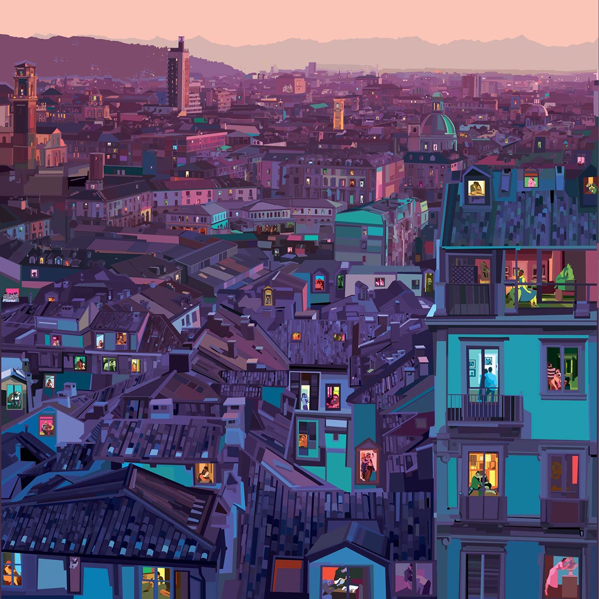 Un passato come disegnatore alla Disney e character designer alla Ferrero, il lavoro come insegnante e illustratore, poi l’arrivo dei figli, una gioia che ti riempie l’esistenza ma ti limita negli spostamenti. In chi come Pierpaolo Rovero ha fatto del viaggio la propria fonte di vitalità ed ispirazione si fa strada l’esigenza di continuare a scoprire il mondo, in un modo o nell’altro. Nasce il progetto “Imagine All The People”, una serie di 24 illustrazioni ambientate in altrettante città, nelle quali attraverso le finestre aperte possiamo entrare nelle case ed osservare cosa accade.