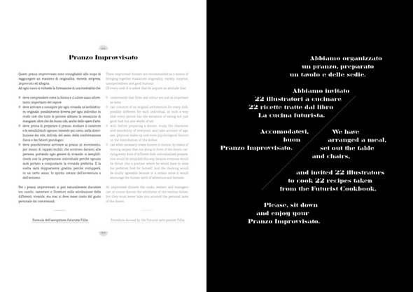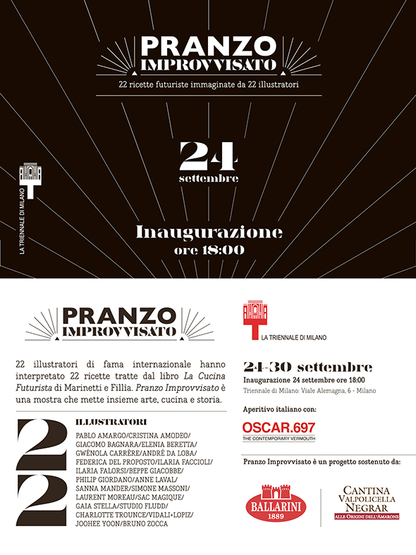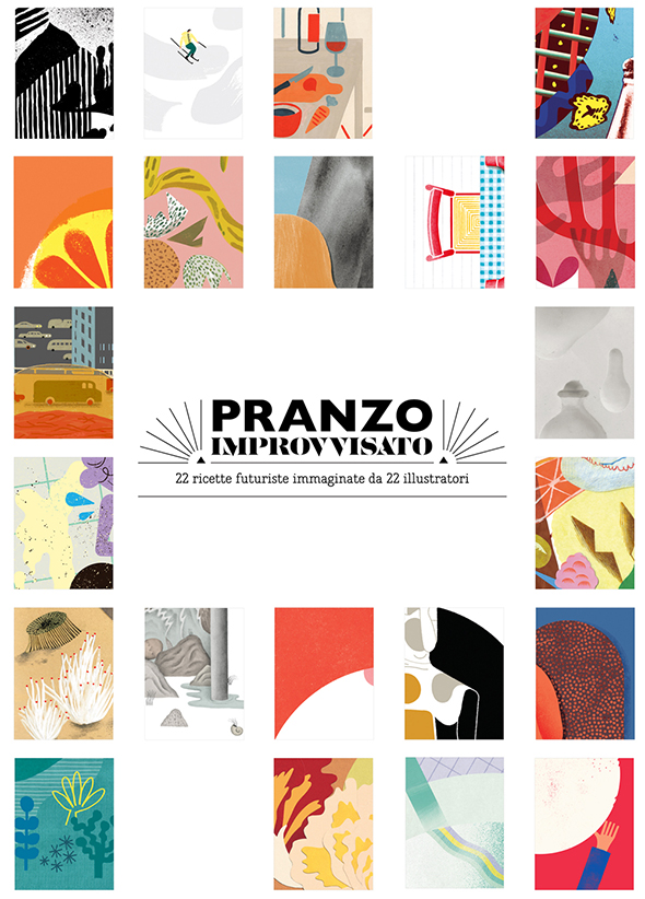 Nel 1932 Marinetti e Fillìa pubblicano il volume “La Cucina Futurista“, una bizzarra raccolta di ricette dai nomi e dalla preparazioni improbabili, ispirate agli ideali del movimento. Nel 2015 alle nostre tre ragazze viene l’idea di far divenire queste 22 ricette il punto di partenza di un progetto più articolato, che potesse mettere insieme il meglio degli illustratori di tutto il mondo. Nasce così Pranzo Improvvisato, che nell’arco di qualche settimana è passato dall’essere un’idea abbozzata sulla carta al divenire una mostra nientemeno che alla Triennale di Milano, con tanto di catalogo (magistralmente realizzato da Due mani non bastano), allestimento su misura (progettato da Nicolò Gazzola e Letizia Abbate) e tappe successive, ancora da svelare.