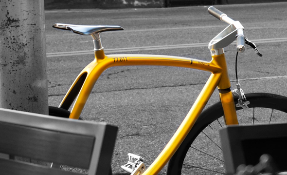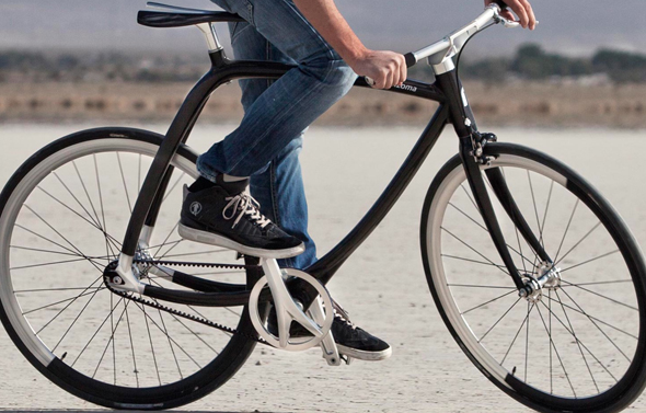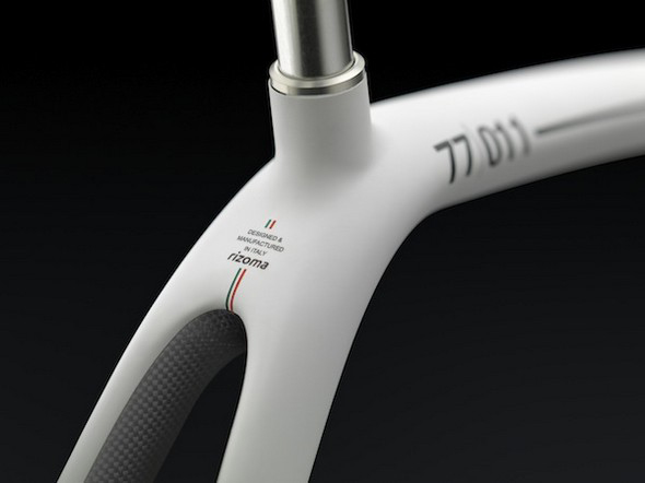 Interamente progettata e realizzata in Italia, la Rizoma 77/011 è un bici a scatto fisso dal design estremamente contemporaneo, con un telaio in fibra di carbonio ed alluminio privo di montante e trazione a cinghia. In caso di utilizzo in città, è consigliato munirsi preventivamente di una enorme catena.