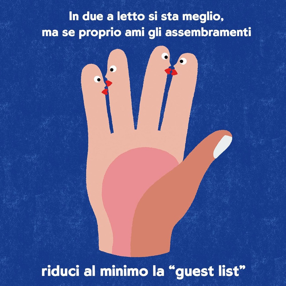 “La collaborazione nasce dal fatto che entrambi ci seguiamo su Instagram e quando sono uscite le regole “stitiche” della Rai Nicola mi scrive e mi chiede se sono interessato a fare un decalogo sul sesso covid-free. Iniziamo così a buttar giù i punti salienti e le illustrazioni. Per me è stato super come progetto perchè spiegare con semplici linee e colori discorsi così complicati e difficili da affrontare significava una bella prova. Il risultato parla da solo.”