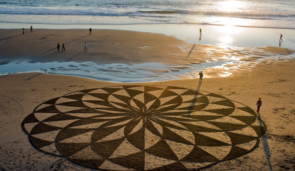 E’ arrivato il momento di rilassarvi per 6 minuti. Ascoltate il rumore del mare guardando l’artista americano Andres Amador realizzare uno dei suoi disegni sulla spiaggia con un comune rastrello da giardino…L’idea gli è venuta una dozzina di anni fa, mentre tracciava figure sulla battigia per spiegare la geometria ad un amico. Prima di realizzare i disegni controlla e sceglie l’area su Google Earth ed il fatto che il mare cancelli in fretta le sue opere non è un problema per Amador: “così non dovrò farlo io per avere una ‘tela’ pulita per un nuovo disegno” – dice l’artista.