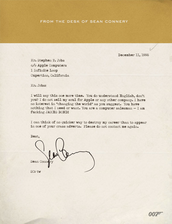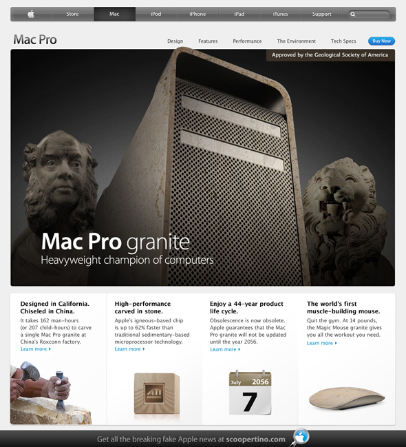 Scoopertino è un un blog costantemente aggiornato sulle ultime novità di casa Apple o, per essere più precisi, sulle “unreal Apple news“. Una satira sottile ed intelligente che prende in giro il colosso californiano con articoli come “Apple unveils low-cost Cornea display” oppure “New Mac Pro granite: no updates till 2056“. Per non parlare della presunta lettera di Sean Connery a Steve Jobs datata 1998… uno spasso!