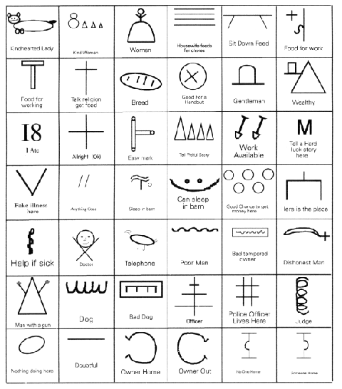Diffusi negli anni della grande recessione americana, i segni hobo sono ormai caduti in disuso ma conservano ancora intatto tutto il loro fascino. Utilizzato dalle persone senza fissa dimora – gli hobo appunto – che si muovevano attraverso gli stati, questo linguaggio utilizzava segni convenzionali tracciati a gesso sui cartelli segnalando il grado di ospitalità o di rifiuto che si sarebbe incontrato o più semplicemente indicazioni pratiche sull’acqua e il cibo.