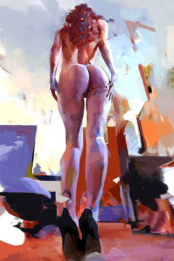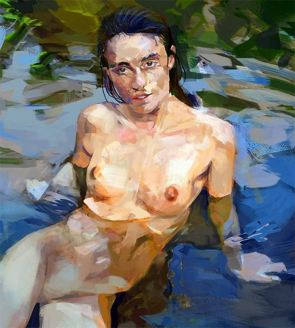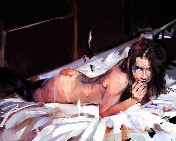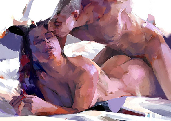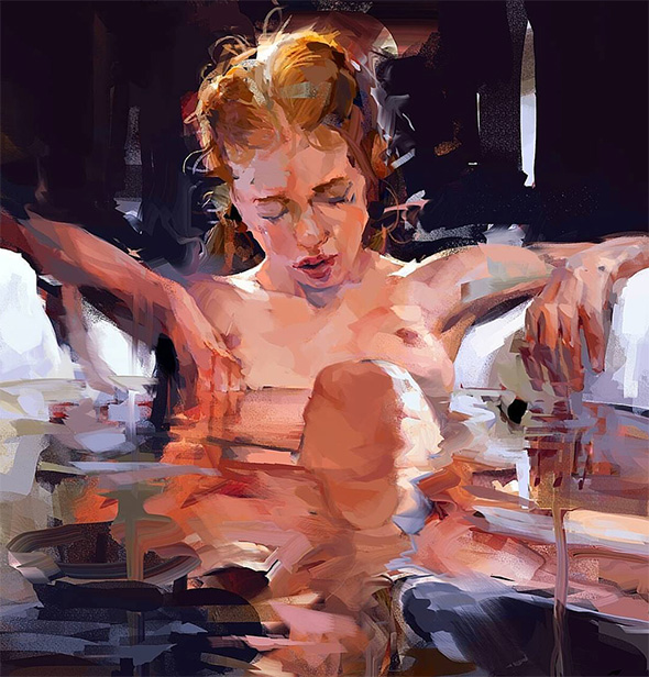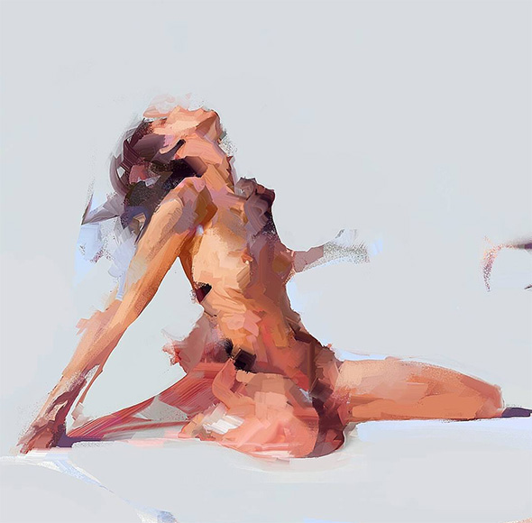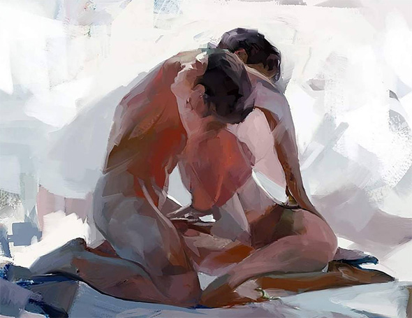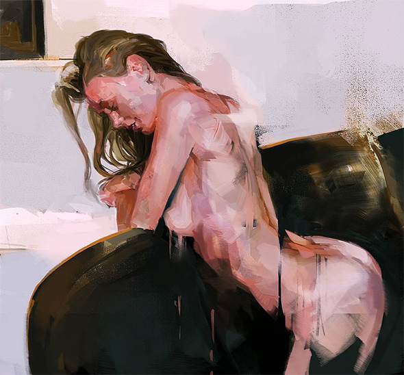 I suoi dipinti sono frammentati, risultato della sovrapposizione di quelli che sembrano essere colpi di spatola più che pennellate vere e proprie. Illustri sconosciuti vengono ritratti nella loro intimità con crudezza, senza mezzi termini, senza essere avvertiti che l’atto artistico è in corso. Talvolta le figure sono volutamente incompiute, volti e intere parti del corpo mancano all’appello. I contorni dei corpi sbavano, invadono lo spazio circostante creando profili grotteschi, deformi. L’umanità trasuda dalla tela, lattiginosa, sincera come la materia di cui è ricoperta.