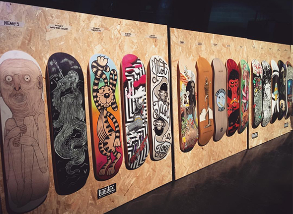 100 delle tavole esposte sono state selezionate tra quelle pervenute attraverso un contest aperto a tutti. Le altre 50 sono state realizzate in parte da artisti “insider” dello skateboarding e in parte dagli artisti della galleria. Di seguito trovate alcune foto che abbiamo scattato durante l’evento.