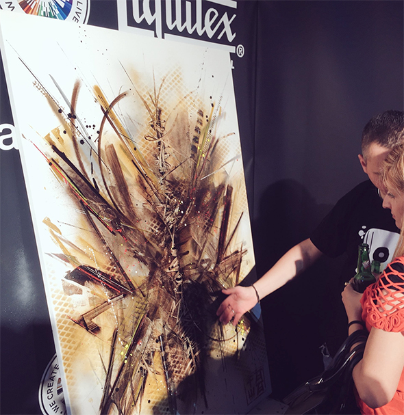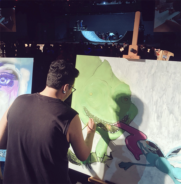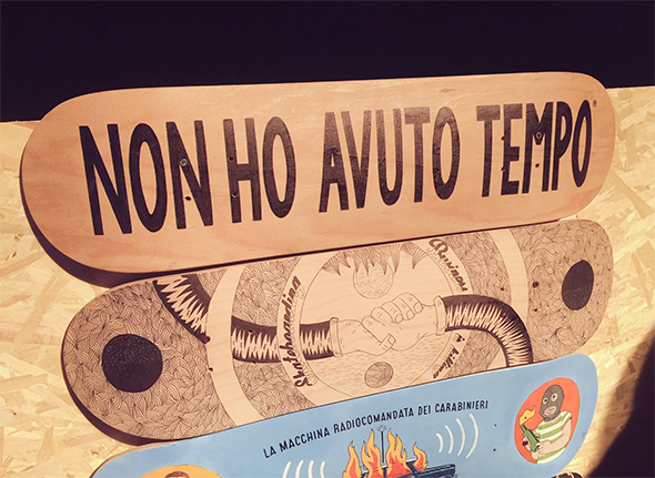 E ne troviamo, a palate. Scorre nelle gambe degli skater che si alternano sull’half pipe montata per l’occasione sul palco, passa per le oltre 150 tavole da skate disegnate, dipinte, scomposte e ricomposte dalle mani di creativi di tutto il mondo; passa nelle tele e nei pennelli degli artisti che si stanno esibendo dal vivo, esce dalle casse sopra alla consolle, che restituiscono musica dai bassi potenti, che ti scuotono da dentro. Noi ci gustiamo una Tuborg fresca e iniziamo il nostro tour a spasso per la prima Skaterboards Confluence milanese della storia.