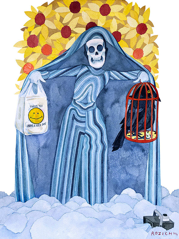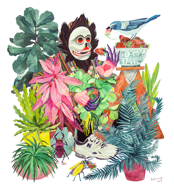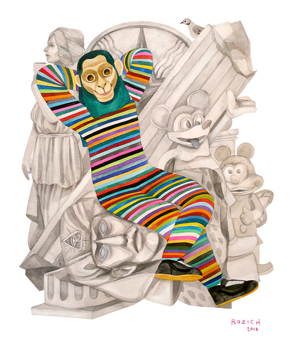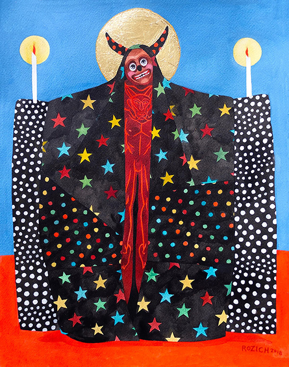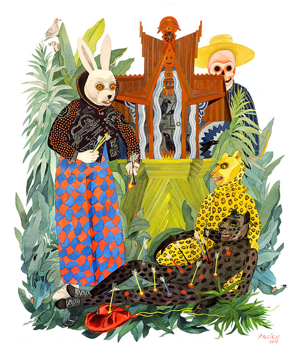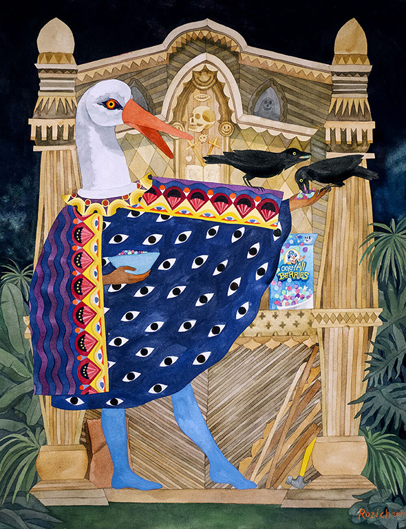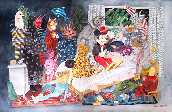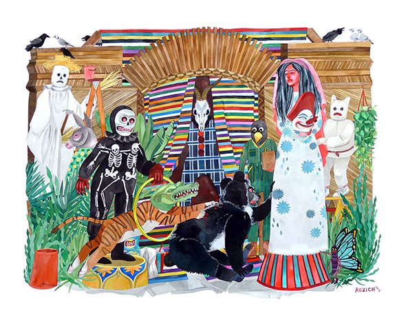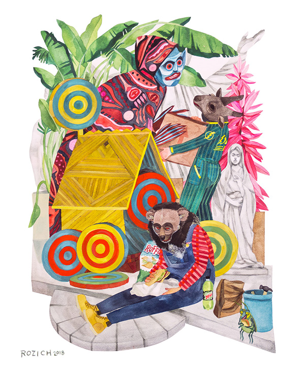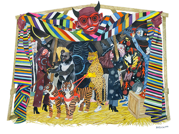 Entrare nel mondo di Stacey Rozich è come assistere alla messa in scena di un incubo a metà strada tra il teatro e il carnevale. I personaggi mascherati e le scenografie che ambientano le sue composizioni sono un mix coloratissimo di citazioni che arrivano dalla cultura pop e folk di diverse regioni del mondo.