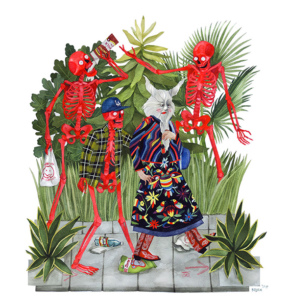 Stacey usa tecniche tradizionali come l’acquarello e il gouache su carta ma si trova altrettanto bene a dipingere su tela e a realizzare murales. Tra i suoi artisti di riferimento ci sono Gauguin, Rousseau e Marcel Dzama. È nata a Seattle, ha studiato al California College of the Arts e alla Creative Academy e ora vive e lavora a Los Angeles. Trai suoi clienti: The New Yorker, Starbucks e Playboy Magazine.