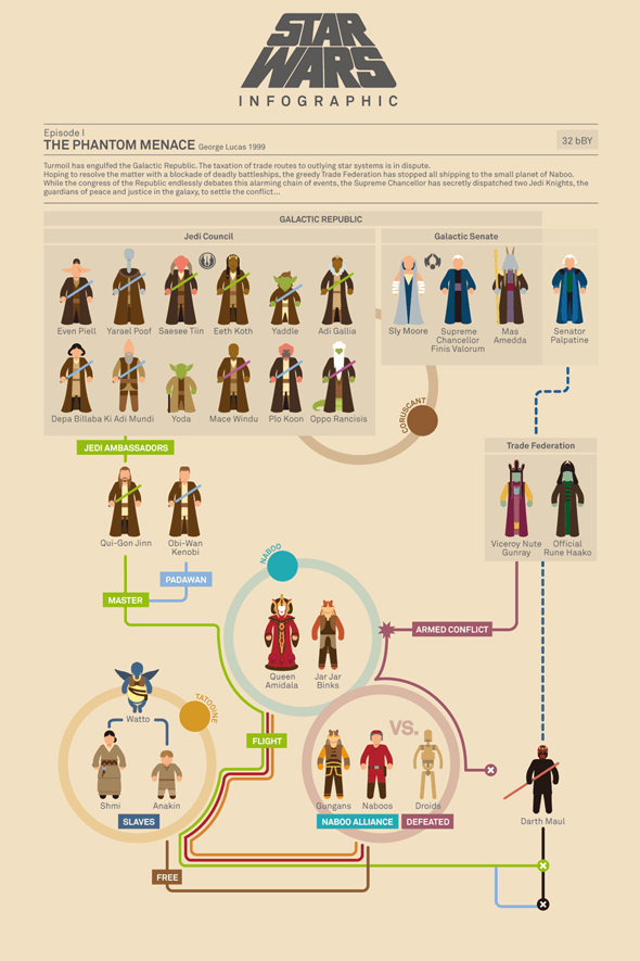 Gli Star Wars addicted apprezzeranno questa serie di infografiche realizzate dal designer ed illustratore Marc Morera (il cui sito sembra essere temporaneamente offline) che, attraverso un sistema di grafici e linee, ci mostrano l’evoluzione e la collocazione temporale dei personaggi, dei conflitti e delle alleanze. No geek no party.