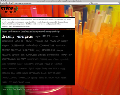 L’altra mattina, devo confessarlo, ero di pessimo umore. Poi scopro questa radio digitale, Stereomood, seleziono il tag che meglio descrive il mio stato d’animo di quel momento e subito parte una playlist che nel giro di 3 o 4 pezzi mi tira davvero su il morale! Magari io sarò leggermente psicolabile… ma caspita funziona!