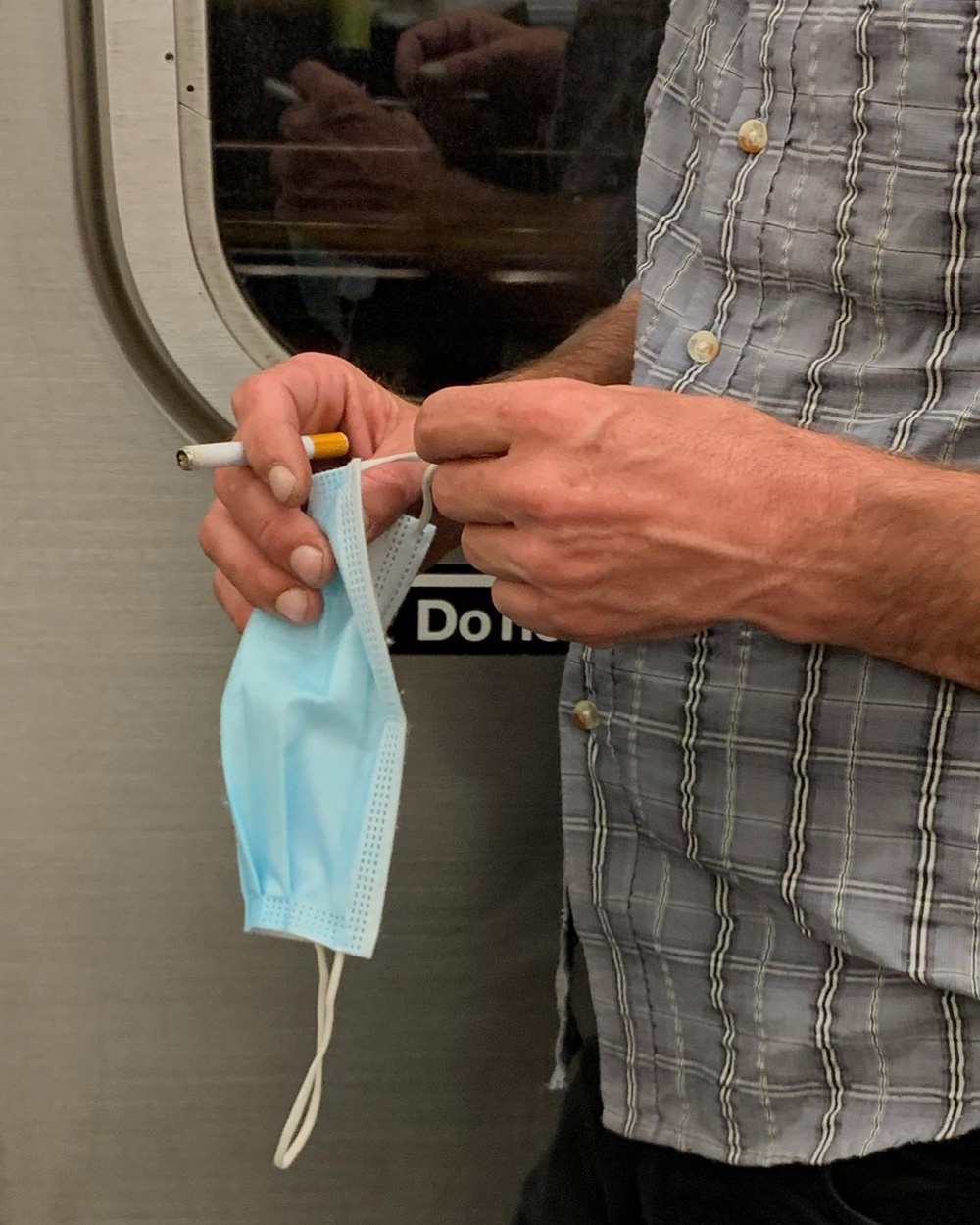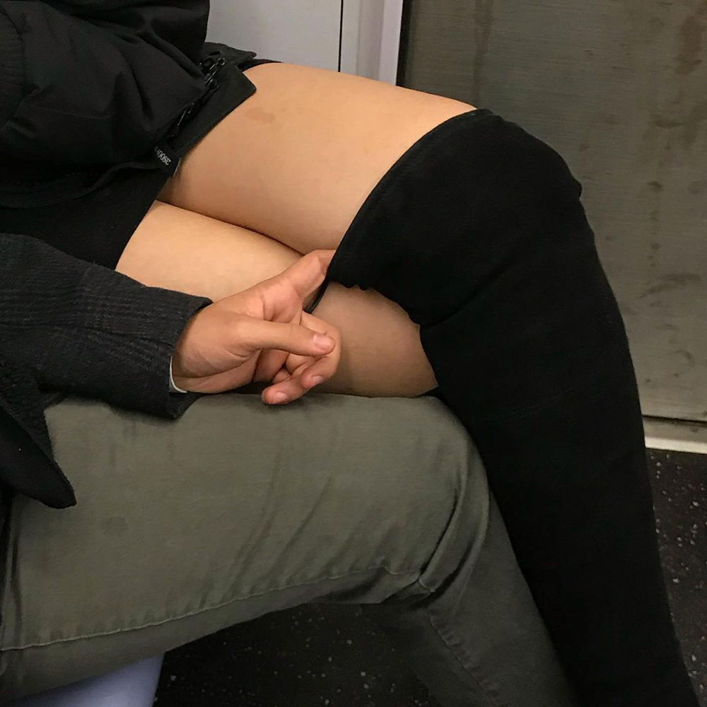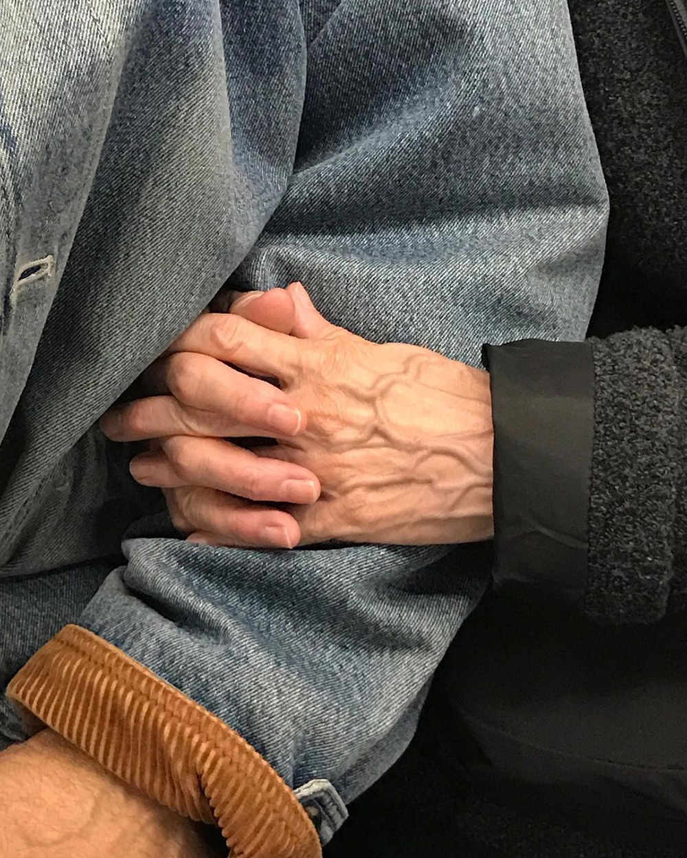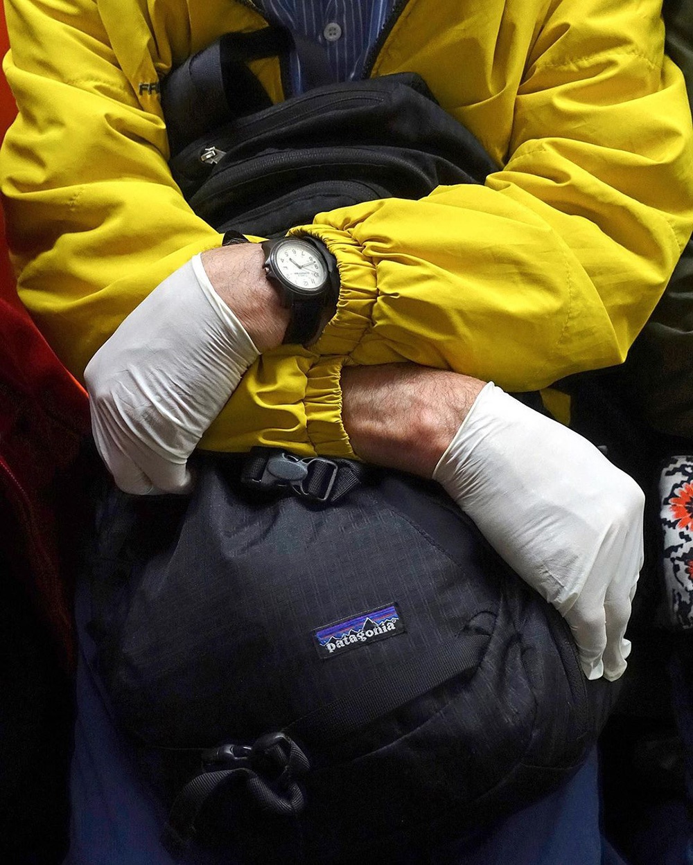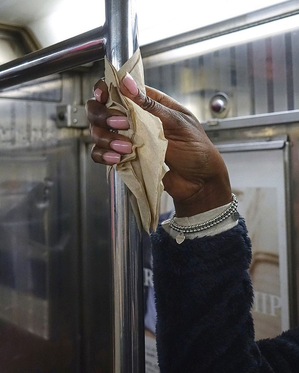 Subway Hands racconta del tempo sospeso ma anche del tempo che passa: dalla moda delle nail art ai tatuaggi, fino agli oggetti che i passeggeri portano con sé, anche i più bizzarri. E poi mani che si stringono, che cingono corpi. È inevitabile notare l’avvento dell’era pandemica: appaiono così mani nascoste dentro a guanti di plastica, mani che ansiosamente si cospargono di disinfettante, che si proteggono dal contatto con le superfici tramite fazzoletti stropicciati.