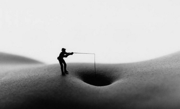 Il fotografo americano Allan Teger è un sapiente conoscitore del corpo femminile, tanto da usarne forme e curve come elementi di un paesaggio su cui costruire, con figure di piccole dimensioni, scene di vita quotidiana in miniatura: l’ombelico diventa un piccolo lago...