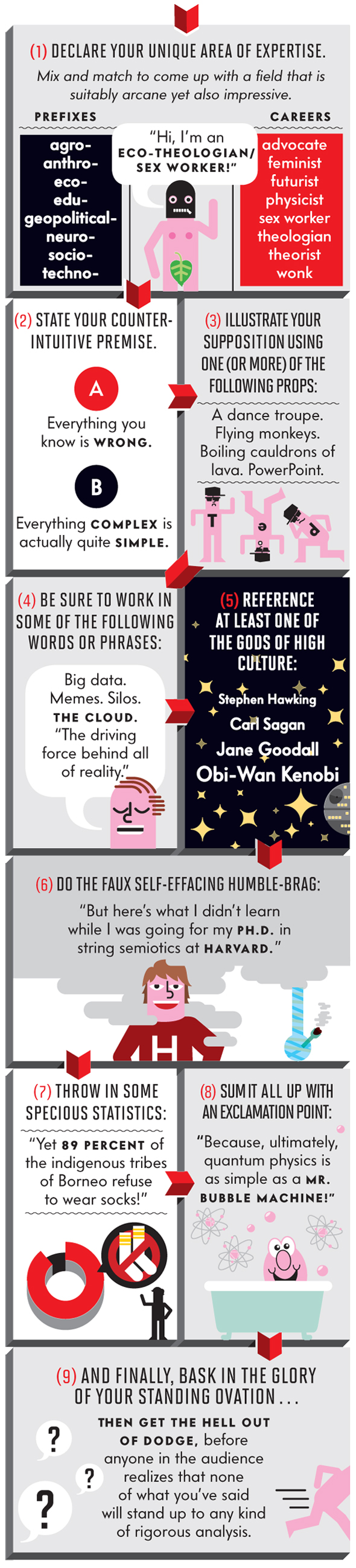The art of faux profundity: nine easy steps to your own audience-flattering TED talk”, in altre parole, come diventare un guru delle famose (e a volte controverse) TED-conferenze in nove comode mosse, pianificate da Bruce Feirstein e illustrate da Walter C. Baumann.