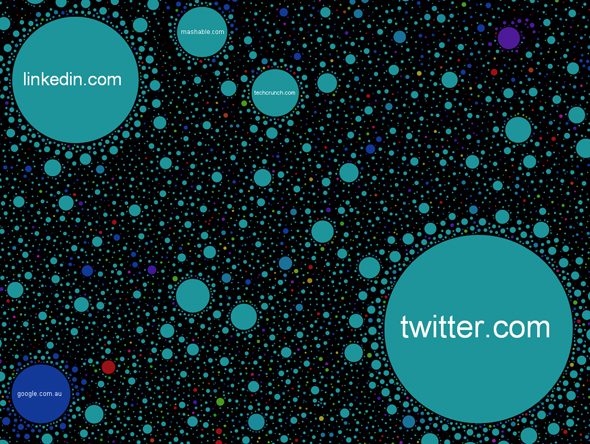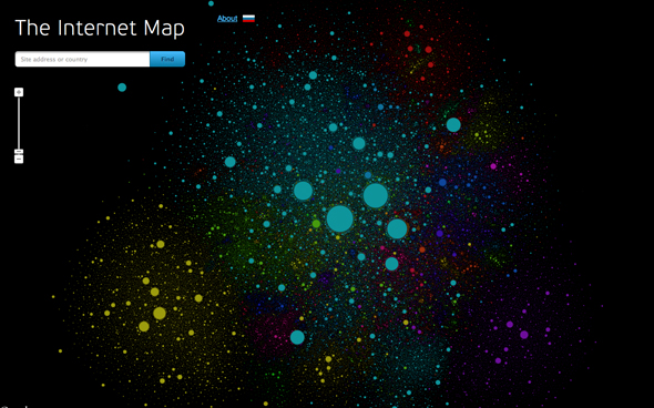 Ruslan Enikeev ha tracciato una mappa di Internet, non in base alla posizione dei siti nello spazio virtuale, ma alla quantità di traffico, con un algoritmo che li trasforma in cerchi di grandezze, avrete già capito, molto differenti. Un universo fatto di enormi soli, minuscoli satelliti, milioni di pianeti. Grande!