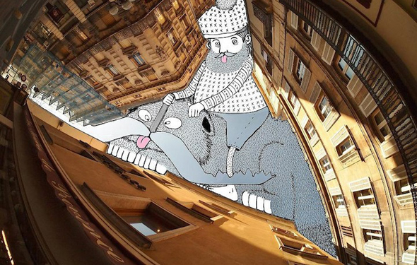 Immaginate di alzare gli occhi al cielo e di vederci disegnato un gigantesco pollo in blue jeans che suona la chitarra. Ecco, con Thomas Lamadieu tutto è possibile. L’illustratore francese si diverte a riempire con personaggi stravaganti i pezzetti di cielo lasciati liberi dagli ingombranti palazzi della sua città, portandoci oltre i confini dello spazio in cui viviamo. Il cielo di Lamadieu si anima così di gufi ed animali di ogni tipo, di un uomo a cena e persino del famoso “uomo della pioggia”.