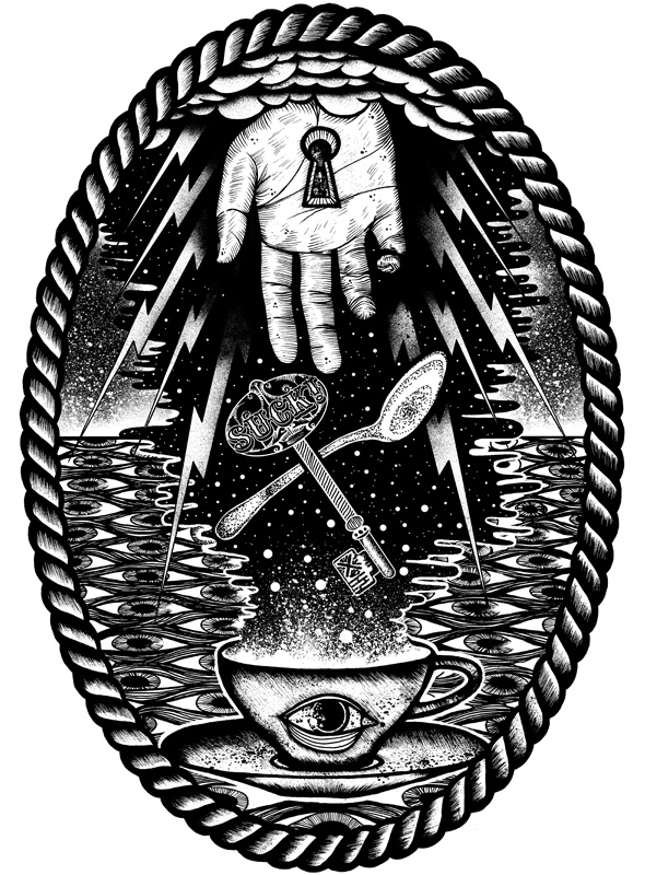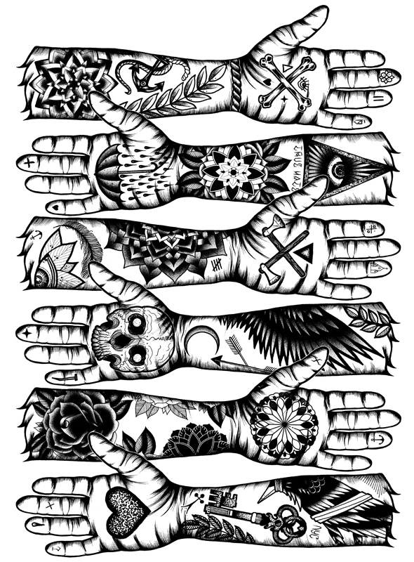 Potrei offrire il mio corpo come tela senza pensarci due volte, se mi trovassi di fronte a Tom Gilmour. L’artista londinese predilige le illustrazioni in bianco e nero, traendo ispirazione dal mondo dei tattoo e mischiando i caratteri tipici dell’old school con il simbolismo esoterico. Un header disegnato da lui ce lo vedrei proprio bene…