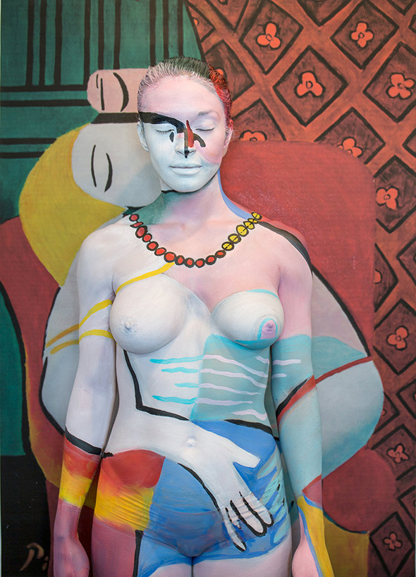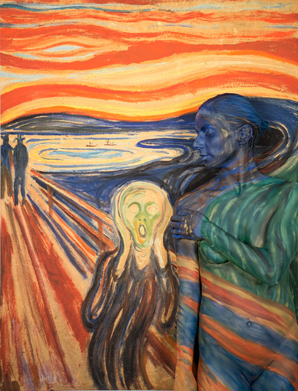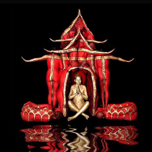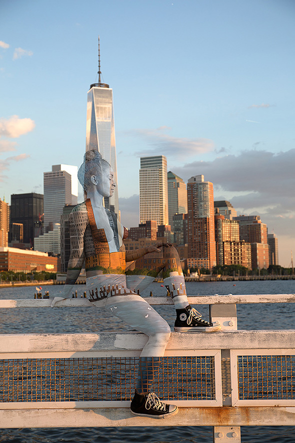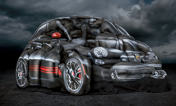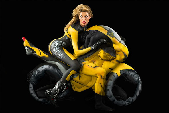 Originaria di Seattle ma di base a New York, Trina Merry è una body painter con anni di esperienza che ha studiato con artisti del calibro di Robert Wilson e Marina Abramovic. La sua creatività si esprime principalmente attraverso due tecniche: la prima è il camouflage, ovvero la mimetizzazione di una figura su un particolare sfondo; la seconda è la giustapposizione dei corpi dipinti per creare forme che riproducono oggetti reali. In entrambi i casi l’effetto è sorprendente, grazie anche alla meticolosità dell’artista e all’agilità dei modelli.