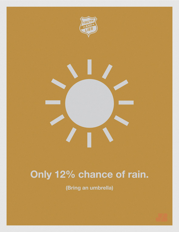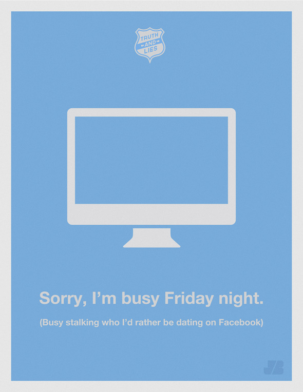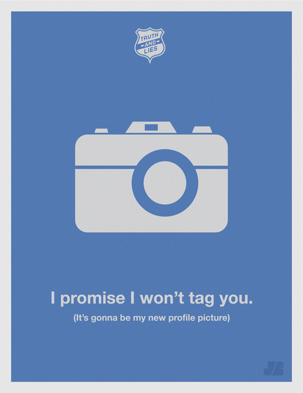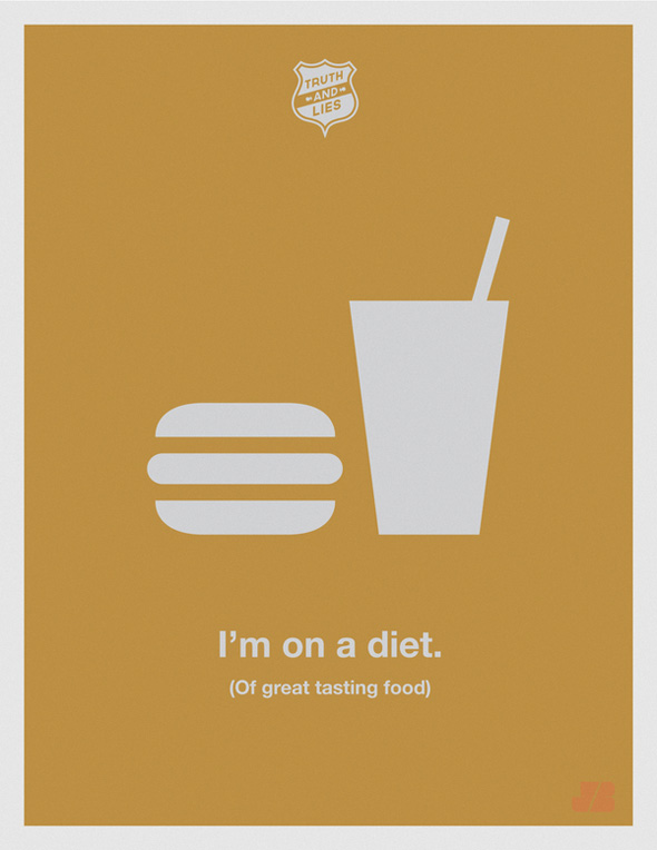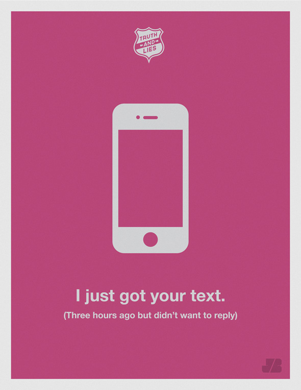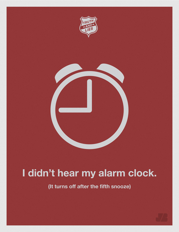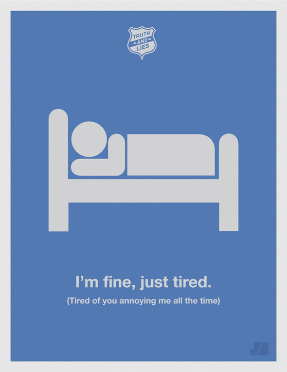 Essere onesti paga (quasi) sempre. Questa serie di poster minimali realizzati da Justin Barber (Barber, ho scritto Barber…) raccoglie e smaschera alcune piccole, innocenti bugie che ci capita di raccontare quotidianamente per sfuggire a determinate situazioni o, semplicemente, per non ferire i sentimenti altrui. Questo è quello che dicimo ma (questo è quello che vogliamo dire)… e lo sappiamo tutti.