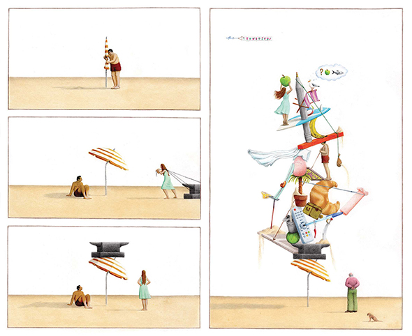 Per sfuggire alla monotonia del lavoro d’ufficio abbiamo cominciato, da qualche tempo a questa parte, a concederci qualche lieta divagazione all’insegna del disegno libero nelle campagne della Valmarecchia. Durante questi ritiri aziendali ci dedichiamo alla sperimentazione e all’improvvisazione più assoluta, senza farci mancare qualche attività ricreativa spesso gastronomica. Queste spensierate parentesi di vita bucolica ci hanno dato lo spunto per inserire negli interstizi della nostra routine di lavoro dei controdisegni di decompressione per sciogliere la tensione.