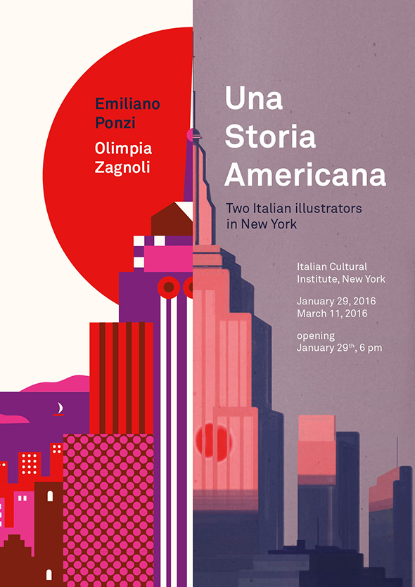 Ma non è di questo che voglio parlarvi oggi, bensì della mostra “Una storia americana. Two Italian illustrators in new York” che inaugurerà il prossimo 29 gennaio presso l’Istituto Italiano di cultura di New York e che raccoglie il meglio della loro produzione degli ultimi 5 anni. Inaugurazione anticipata domani pomeriggio da un incontro con i 2 illustratori presso la Society of Illustrators di NY, moderato da Josh Cochran. Una storia americana è anche un libro, edito da Corraini Edizioni, con 2 splendide copertine illustrate per l’appunto da Emiliano ed Olimpia. Chi sa scegliere faccia un passo avanti!