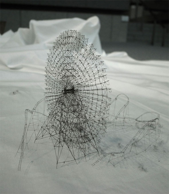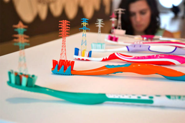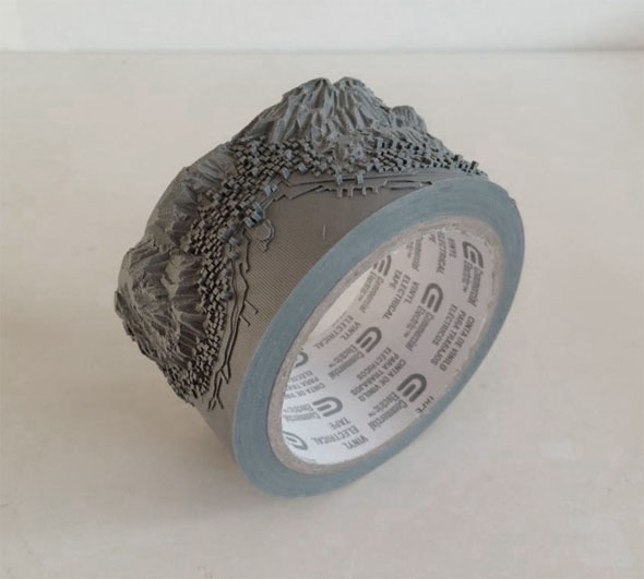 L’artista giapponese Takahiro Iwasaki è celebre per le sue sculture non convenzionali, realizzate utilizzando i materiali più strani e disparati: fili elettrici, tessuti, spazzolini da denti. Senza contare gli impressionanti interventi su rotoli di nastro adesivo che riproducono paesaggi e città. Da osservare con lente d’ingrandimento.