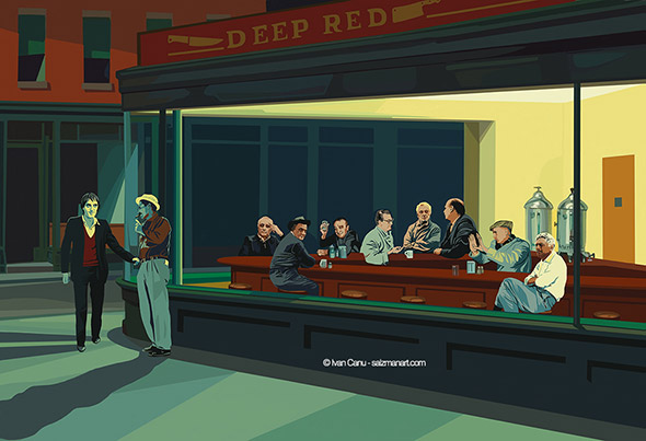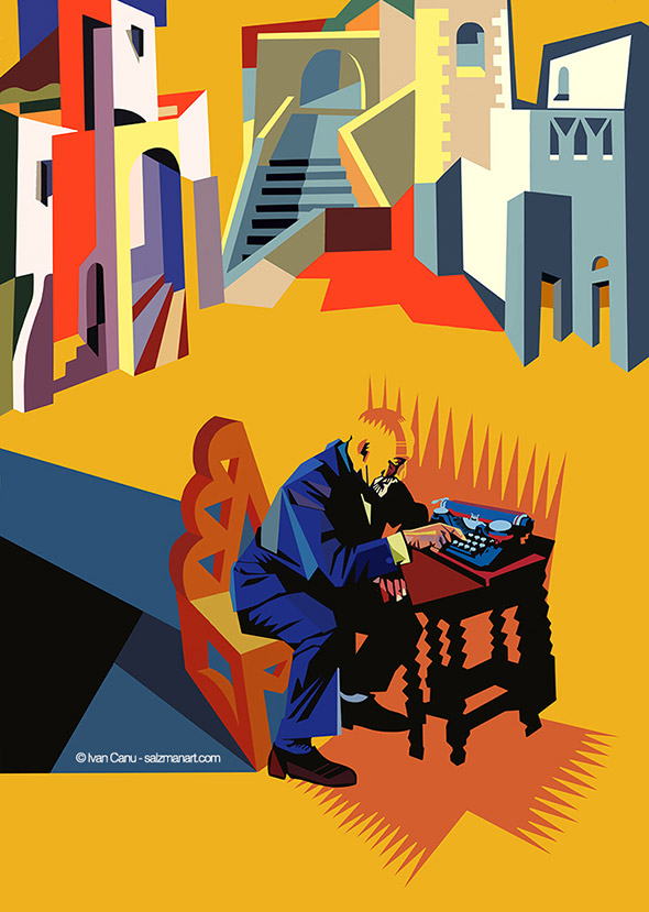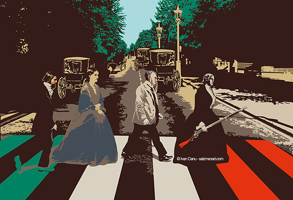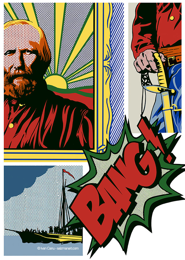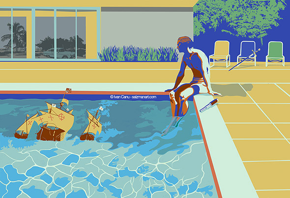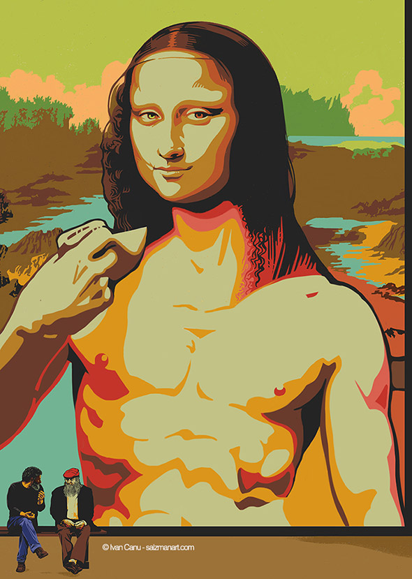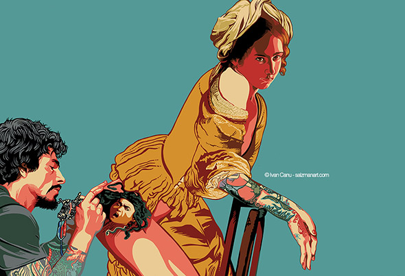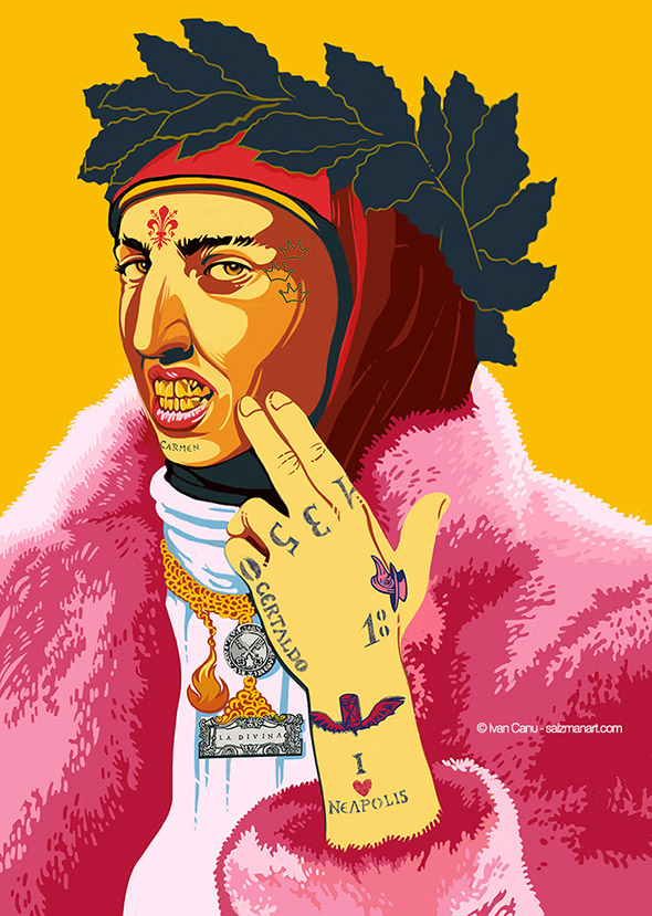 Il libro contiene anche diverse illustrazioni (oltre a 50 ritratti) realizzate da Ivan Canu. Le tavole sono spiazzanti perchè l’illustratore ha completamente decontestualizzato la figura dei personaggi e il periodo storico in cui sono vissuti. Ecco allora che Boccaccio assume le sembianze di un trapper con tanto di pelliccia fluo e tatuaggi sul viso, Cristoforo Colombo gioca annoiato con modellini di caravelle in piscina a Copacabana e Caravaggio veste i panni di un tatuatore impudicamente al lavoro sul didietro di Artemisia. Il motivo di questa scelta ce lo spiega l’autore stesso: “Mi sono divertito con citazioni e rimandi fuori dal tempo storico, perché tutti abbiamo studiato Dante e Leopardi, Manzoni e Ungaretti e i loro visi, il loro essere persone nel loro tempo ci sfuggiva per via del peso titanico delle loro opere ormai fuori dal tempo. Oppure della Gianna o di Pavarotti, abbiamo seguito il mutare del tempo sulle loro fattezze, con la stessa sorpresa con la quale ci vediamo quarantenni in viso ma ancora ventenni nello spirito. Mi è piaciuto collocarli nel nostro presente, dove ogni informazione è orizzontale e accessibile, muoverli in visioni che spesso sono quelle di altri artisti a cui ho chiesto in prestito il vocabolario“.