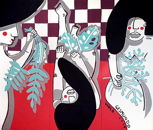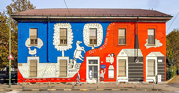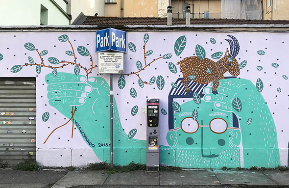 Viola Gesmundo è originaria di Foggia ma la sua attività recente si divide tra Rotterdam e Torino, città dove si è formata come architetto. L’illustrazione è diventata il suo unico lavoro e ha trovato una sintesi con l’architettura nella street art, con cui Viola ricerca l’interazione tra lo spazio metropolitano e l’uomo.