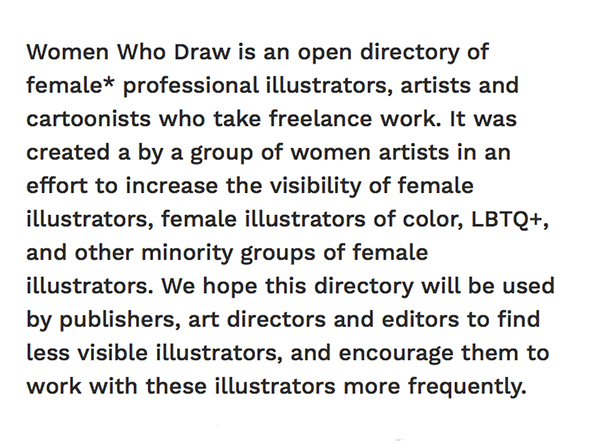 Women Who Draw ovvero Donne Che Disegnano è un nuovo fantastico sito che si propone di raccogliere sotto un’unica directory tutte le illustratrici freelance del mondo. Fondato da un anonimo gruppo di donne, scioccate nel constatare come il numero di commissioni femminili nel panorama attuale sia incredibilmente più basso di quelle maschili, il progetto si propone di incoraggiare art directors, case editrici e designers ad ingaggiare illustratrici, e ne ospita una lista sempre crescente.