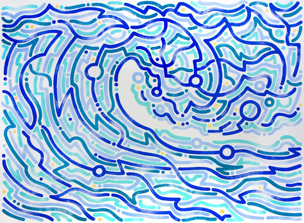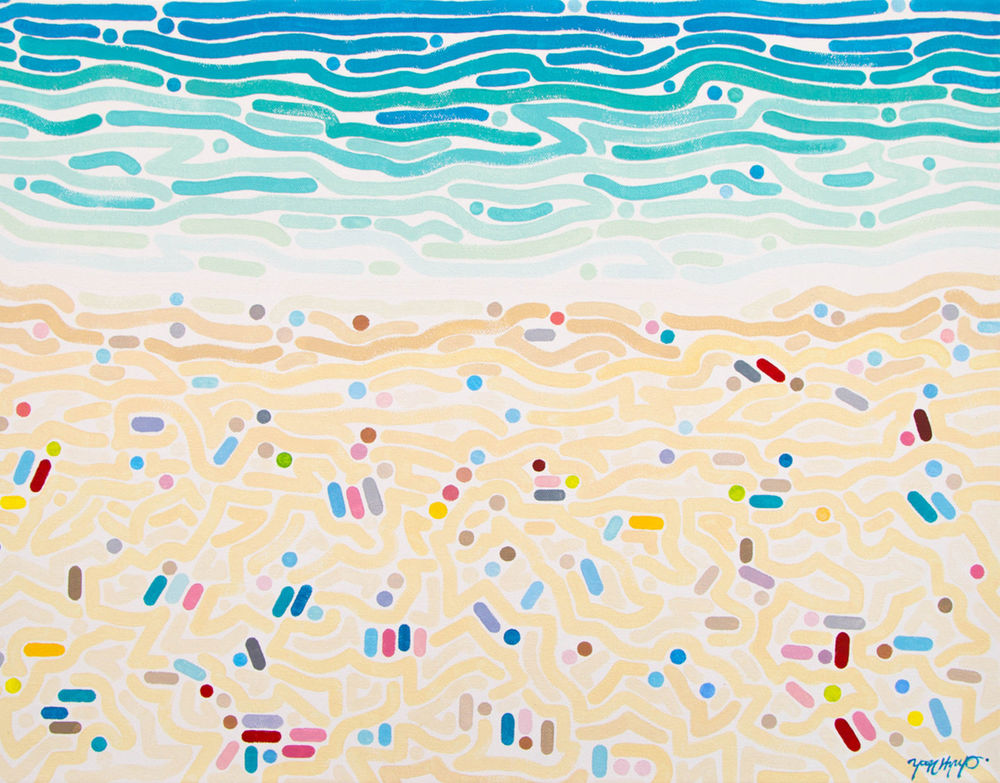 SeoulSound of FridayAugurio per una luminosa giornata di sole è il murales newyorchese, realizzato nel 2014 da Yoon Hyup per il marchio Rag&Bone, che rappresenta un tappa importante nel suo percorso artistico, perché coniuga elementi tradizionali coreani con il suo stile pop. La palette cromatica usata è lo “Obangsaek”, lo schema coreano tradizionale di cinque colori (rosso, blu, giallo, bianco e nero) che incarna le cinque direzioni cardinali e i cinque elementi. Il lavoro inoltre cita elementi e simbologie della cultura coreana tradizionale. Nella foto di fronte al murales lo stesso Yoon.Move onThe waveSound of FridaySpiaggia di La Concha