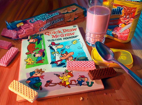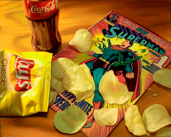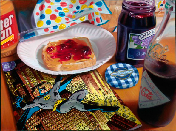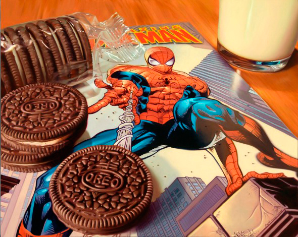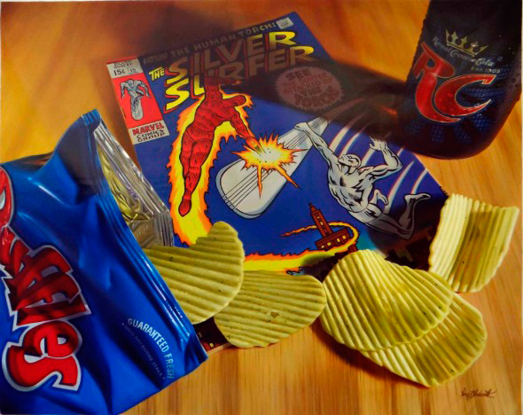 To most teenagers, snack foods and comics are the perfect combo for a relax afternoon after school. To Doug Bloodworth, floridian painter learned in hyperrealism, they revealed as an outright source of inspiration, so that they became his favourite painting theme: artworks combining hyperrealism and pop art, creating an original, totally enjoyable mix.
